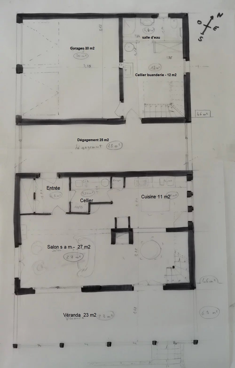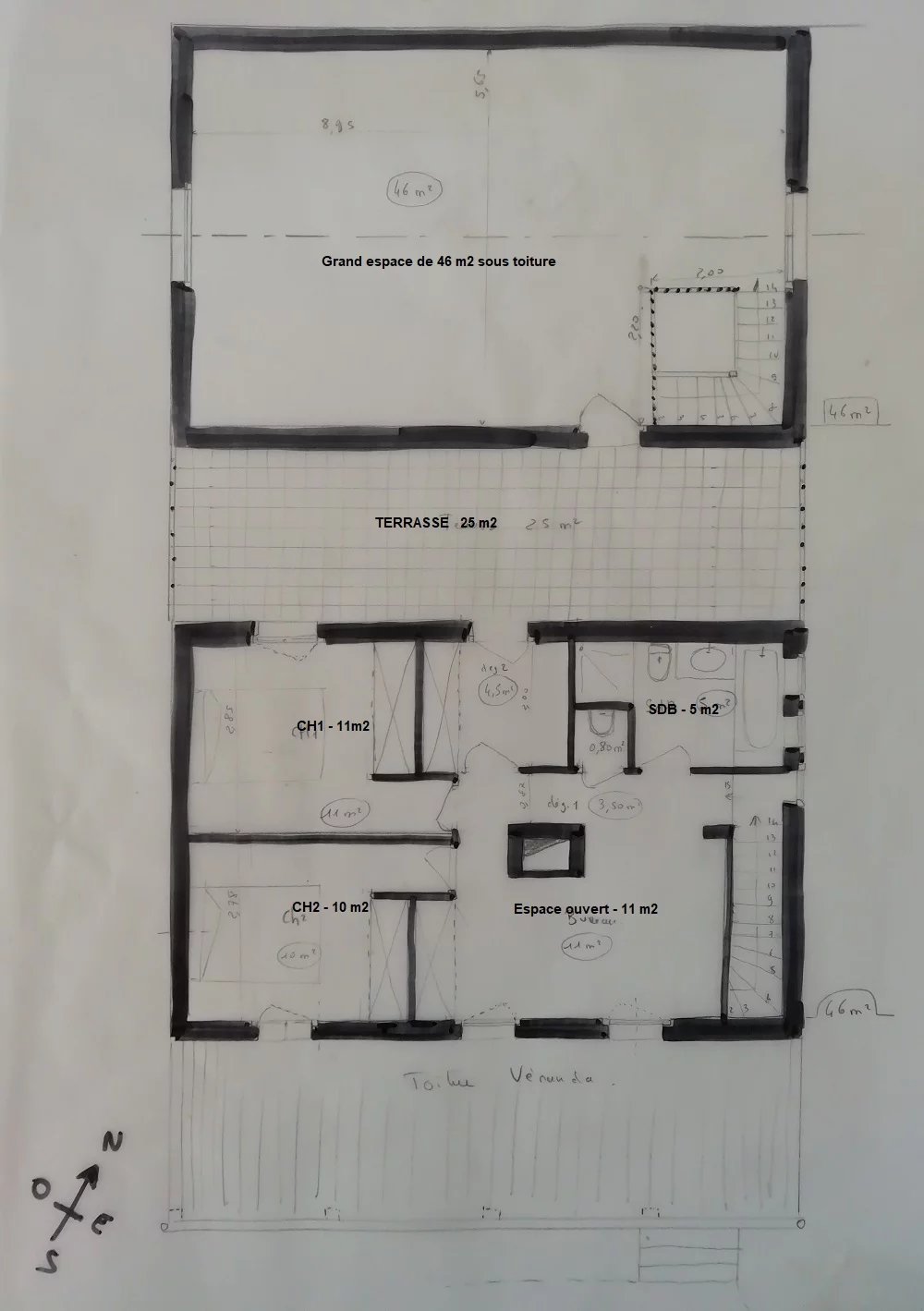 1er étage : 3 chambres avec grands placards + grand espace ouvert de 46m² > possibilité de faire 2 / 3 chambres ou appartement T2 autonome, 2 Wc, 1 salle de bains.